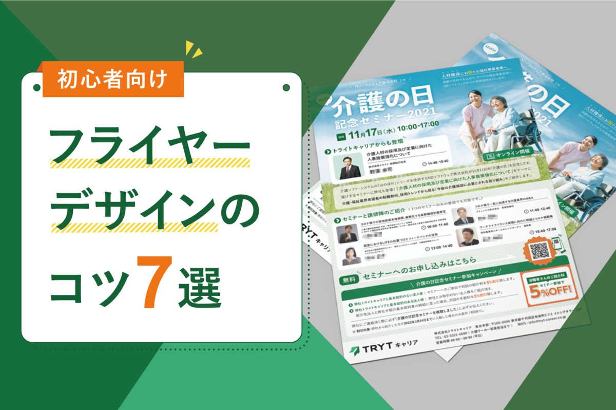 こちらの昨年開催されました「介護の日記念セミナー」イベントフライヤーを例に7つのコツをご紹介させていただきます! 販促用フライヤー作成に興味がある方、制作に悩んでる方は少しでも何か参考になりましたら幸いです!
